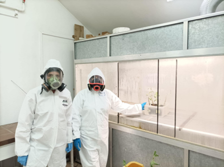Prowadzono również testy laboratoryjne nad wpływem różnych dawek ozonu na wybrane gatunki szkodników i mikroorganizmów, oceniano fitotoksyczności ozonowanej wody dla roślin. Wykonany został monitoring nalotu owadów za pomocą pułapek zapachowych, białych lub zielonych kołków imitujących pędy szparagów pokryte lepem czy też roślin pułapkowych oraz monitoring występowania mikroorganizmów szkodliwych dla szparaga (fot. 1, fot. 2). Wykonano pomiary biometryczne wypustek i gałęziaków, obliczono plon, wykonano analizy chemiczne. Wykonano szczegółowe analizy zbiorowisk grzybów i bakterii obecnych zarówno na powierzchni jak i wewnątrz tkanek wypustek i gałęziaków. Wykonana została identyfikacja grzybów i bakterii do rodzaju lub gatunku metodami klasycznymi na podstawie cech morfologicznych (kształt, budowa ściany komórkowej, zdolność do wytwarzania przetrwalników) i biochemicznych kultur oraz metodami molekularnymi opartymi na analizie DNA.