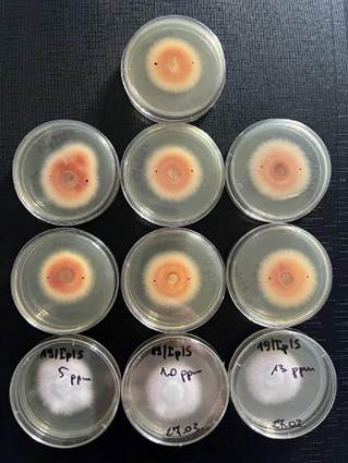 Badania laboratoryjne wykazały, że ozon w wyższych stężeniach >6 ppm może powodować fitotoksyczność roślin modelowych (bobu), choć nie wpływa bezpośrednio na śmiertelność mszyc (fot. 8), nie wpływa również na ich rozrodczość (fot. 9). Nie wykazał również istotnego wpływu na liczebność ziemiórek, ważnych szkodników glebowych (fot. 10), które występują na plantacjach szparaga, gdzie stosuje się podłoża popieczarkowe. Z badań laboratoryjnych nad szczepami referencyjnymi bakterii wynika, że woda ozonowana < 3 ppm ogranicza w wypustkach liczbę Gram-ujemnych bakterii i drożdży chorobotwórczych dla człowieka i tych związanych z roślinami (fot. 11). Woda ozonowana w małym stopniu ograniczała rozwój testowanych grzybów (fot. 12) Zabieg ozonowania nawet 10 ppm ozonu nie pogarsza jakości wypustek (fot. 13).