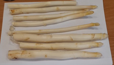 Badania wykonane w pakowalni w Poświętnie wykazały, że zastosowanie ozonowanej wody do dezynfekcji wypustek szparaga spowodowało zahamowanie wzrostu bakterii w porównaniu do prób kontrolnych. Woda ozonowana oddziałuje biobójczo na bakterie, w związku z czym zabieg przemywania wypustek sprzyjał ich trwałości podczas przechowywania. Również tempo starzenia się wypustek jest spowolnione, co przyczyniło się do dłuższego zachowania ich świeżości. Ozon w wodzie zwiększył ilość fruktozy i glukozy, błonnika oraz ilość substancji pożądanych w wypustkach, korzystnych dla zdrowia – polifenoli. Pozwoliło to na uzyskanie produktu o lepszych parametrach i podniosło przez to rynkową atrakcyjność szparaga. Płukanie wypustek w wodzie ozonowanej przez 5 i 10 min wpłynęło też na zwiększone wymywanie przylżeńców z wypustek podczas płukania, które są problemem dla plantatorów stosujących w uprawie podłoże popieczarkowe. W czasie przechowywania zakupionych od innych producentów szparagów zielonych i białych, największy ubytek masy zarejestrowano w kontroli. Po czterech dniach po zastosowaniu ozonowania ubytek masy wypustek zielonych był 2-krotnie mniejszy niż w kontroli, a po 11 dniach – średnio o ok. 42% mniejszy. Podobnie, ozonowanie spowodowało większą trwałość wypustek białych. Moczenie wypustek w wodzie ozonowanej wpłynęło na zmniejszone występowanie przylżeńców (fot. 7).